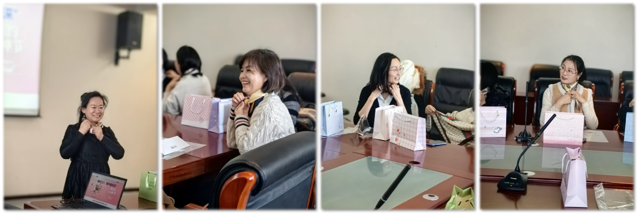 活动伊始,贺海明书记和马红彬院长向全体女性教职工表达了节日问候,祝愿她们健康美丽、家庭幸福、工作顺利、科研硕果累累。接下来,工会委员吴晓丽老师引领大家学习了佩戴丝巾的礼仪,每位参与者手持一条丝巾,通过实际操作展现自己最美的一面。女性教工们深入了解了丝巾的发展史、基础知识、如何挑选丝巾、丝巾的几种常用系法以及配色原理。活动还根据不同衣装、脸型和肤色等方面,为参与者传授巧妙搭配丝巾的技巧,并教授实用而快捷的打丝巾方式。