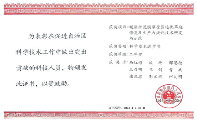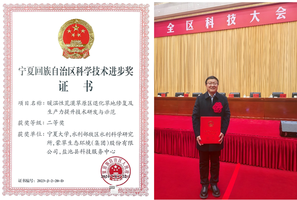 11月25日,全区科技大会在银川召开。会议宣读了《自治区人民政府关于2023年度自治区科学技术奖励的决定》,我院马红彬教授团队与学院林学学科、水利部牧区水利科学研究所等单位申报的“暖温性荒漠草原区退化草地修复及生产力提升技术研发与示范”获自治区科技进步二等奖。据悉,该成果在宁夏和内蒙古暖温性荒漠草原,诊断了草地生态现状,建立了退化荒漠草原修复技术、生态家庭牧场水-土-草-畜多元化调控模型和技术,构建了荒漠草原多元化饲草供给模式并进行示范推广,助力了暖温性荒漠草原草牧业高质量发展。