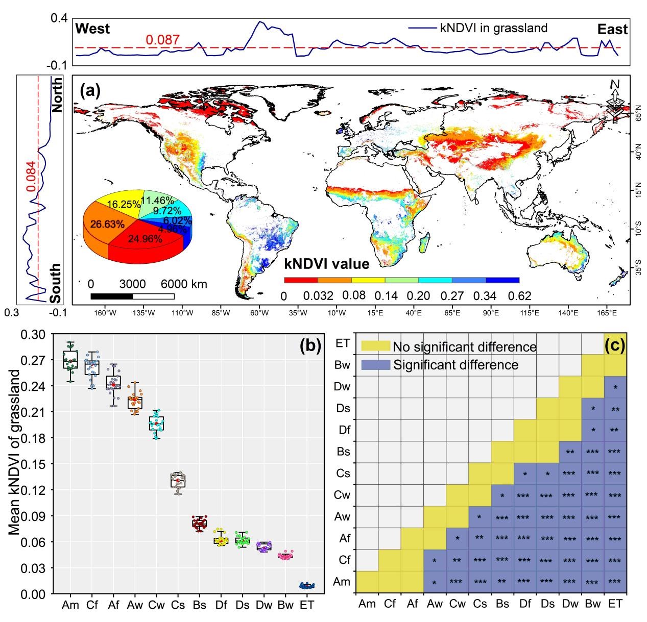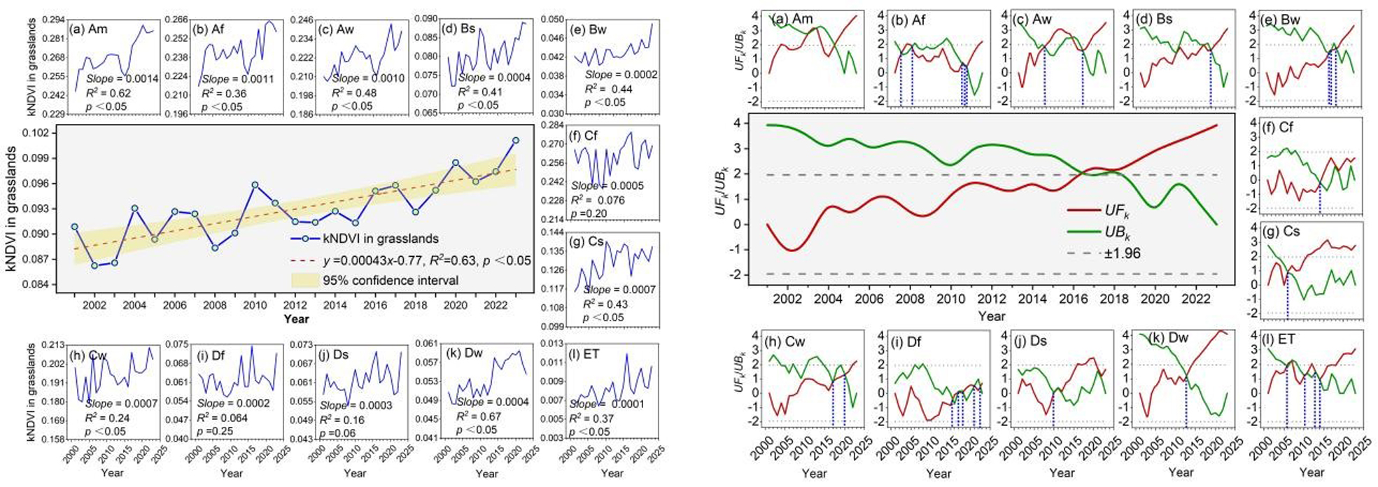 近日,William希尔水土保持与荒漠化防治团队在《Environmental Research》(IF=7.7)发表研究,基于2001-2023年全球草原数据,借助谷歌地球引擎(GEE)和核归一化植被指数(kNDVI),揭示全球草原时空变化及驱动力。