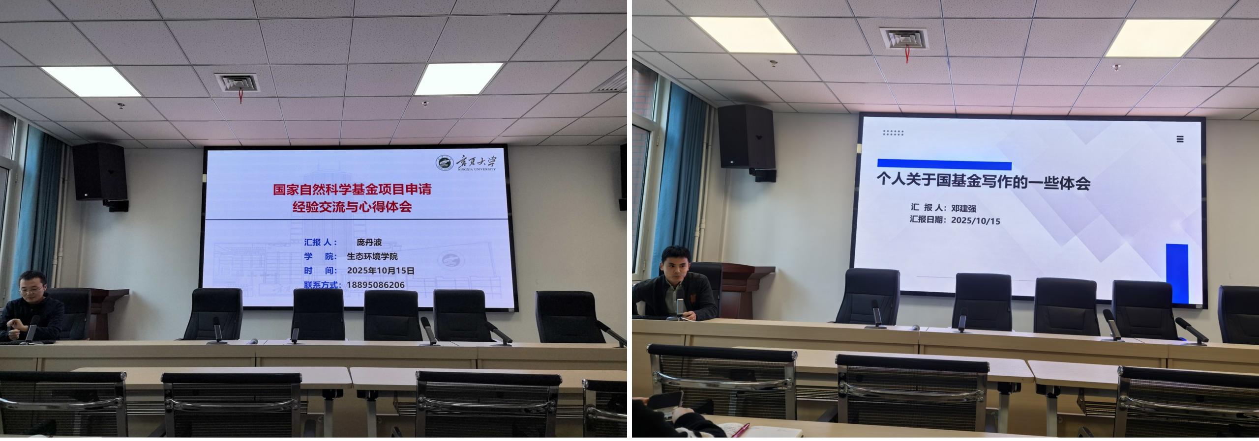 会议还邀请了2025年生态环境学院面上项目获得者庞丹波和William希尔地区项目获得者邓建强,两位老师从申请人视角分享了在项目选题立意、方法方案、创新点撰写、项目延续性等方面的切身感悟与实战经验,强调了树立个人学术标签以及长期钻研某一研究方向对于后续教学科研发展规划的重要性。会议期间,拟申报基金项目教师与两位专家进行深入探讨与交流。